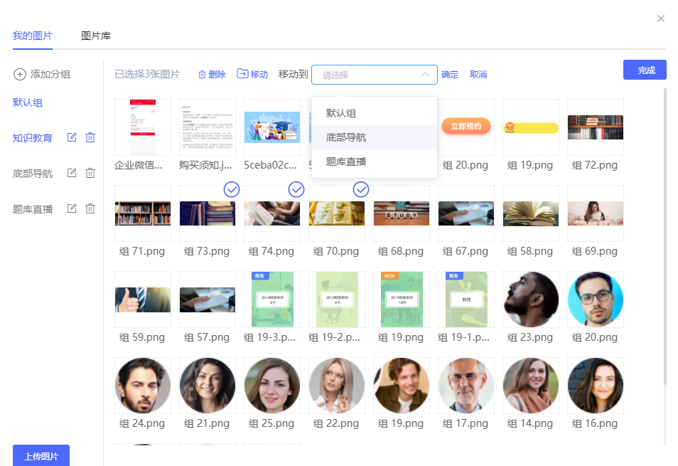 4)移动:选择分组,点击管理,选择图片,点击移动到哪个分组,点击确定、完成。即可移动成功。也可在此进行批量删除。